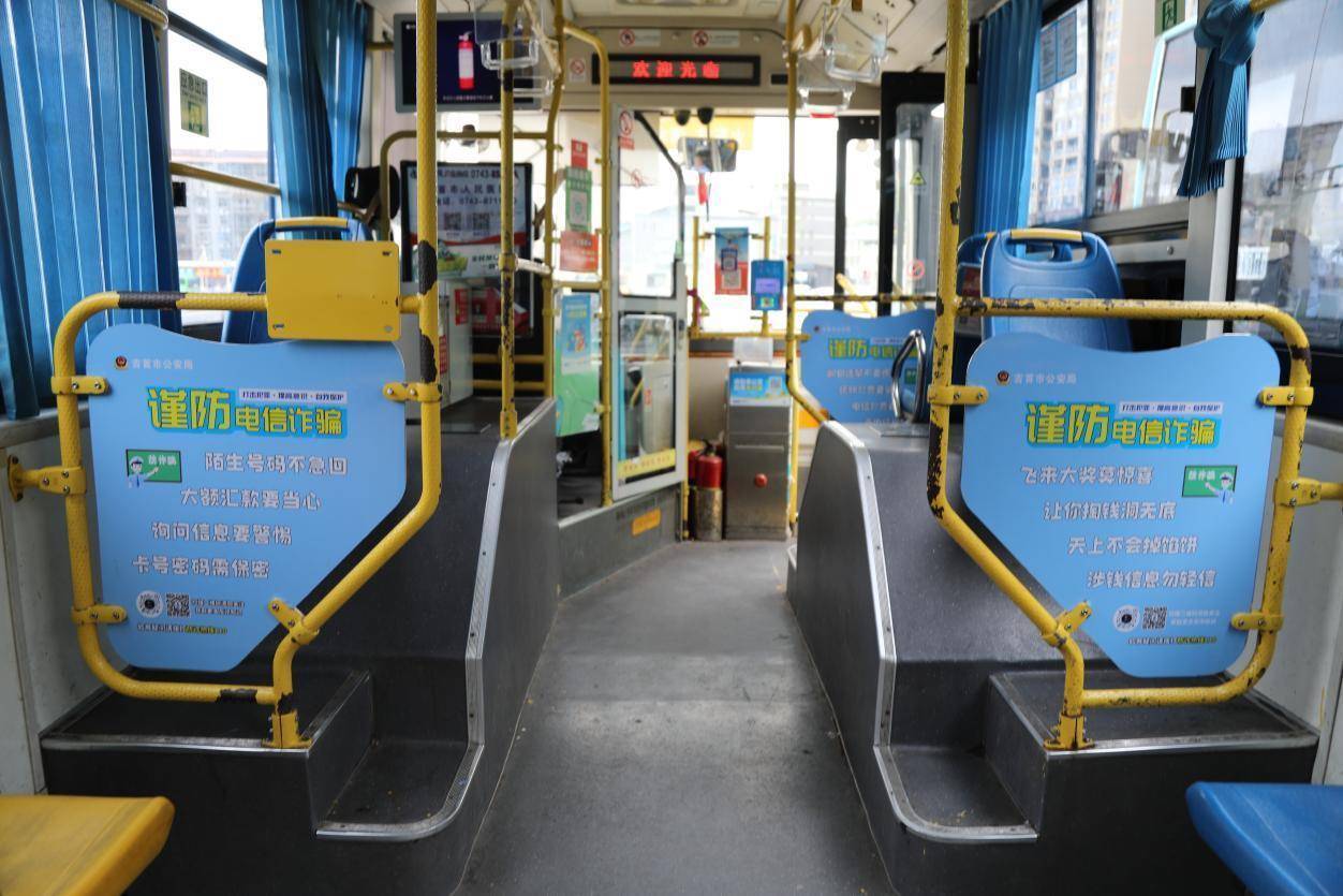 这两台公交车别具特色,车身披着“警企携手,反诈同行”“谨防电信诈骗”“遵守交通法规”等醒目的标语,车厢内还张贴着图文并茂的宣传海报。公交车变身安全堡垒,化为“抬眼可见、触手可及”的安全课堂,让市民在乘车途中就能轻松获取交通安全、防骗反诈知识。